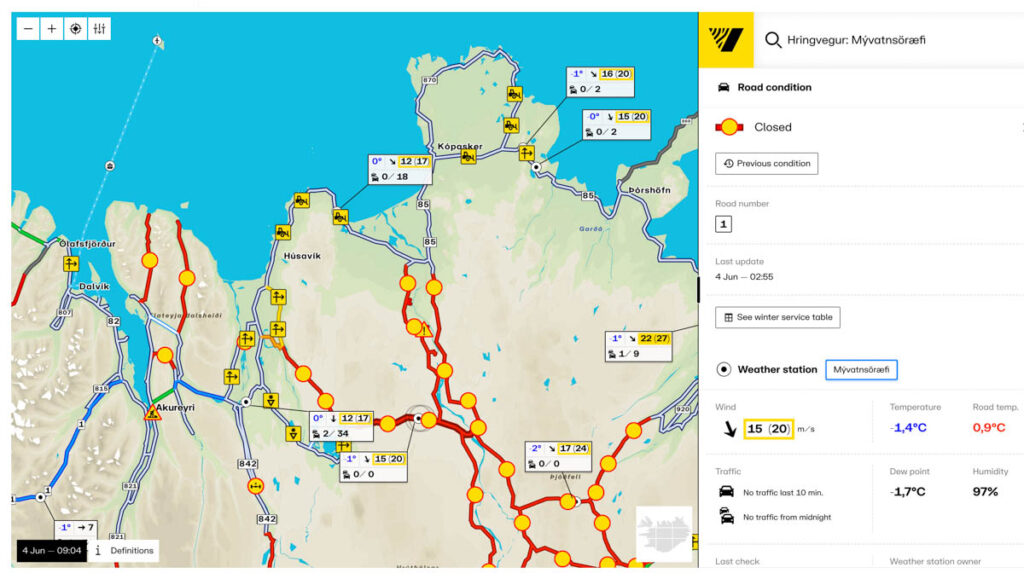 - Můžete se okamžitě podívat na road.is, jestli nedošlo k nějakým změnám stavu silnic (např. zavřená silnice nebo její otevření)